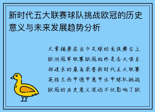 立即咨询文章摘要:在当今足球的竞技舞台上,欧洲冠军联赛(欧冠)始终是各大俱乐部追求的最高荣誉。新时代五大联赛(英格兰、西甲、德甲、意甲、法甲)球队挑战欧冠的历史意义深远,不仅影响了欧洲足球的格局,也深刻改变了世界足球的竞争态势。本文将从四个方面深入分析五大联赛球队在新时代背景下挑战欧冠的历史意义与未来发展趋势。首先,探讨新时代五大联赛球队在欧冠中的竞争地位以及他们所面临的挑战;其次,分析五大联赛球队挑战欧冠对各国足球水平提升的推动作用;第三,研究五大联赛球队参与欧冠的经济效益与全球化趋势;最后,探讨五大联赛球队如何应对未来欧冠竞争中的变革与挑战。通过这些分析,本文将揭示新时代五大联赛球队挑战欧冠的深远影响和未来发展趋势。